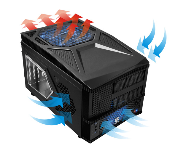 Ein 20 cm großer blauer Abluft-LED-Lüfter oben und ein 9 cm großer blauer Ansaug-LED-Lüfter vorne sind bereits vorinstalliert und erhöhen den Kampfgeist mit Lichteffekten. Zwei weitere 6 cm-Lüfter in der Rückseite erhöhen zusätzlich die Gesamtzirkulation der Luft.