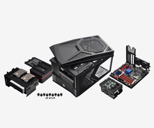 Eine speziell entwickelte modulare Struktur bietet eine äußerst bequeme Möglichkeit, ein hochgradig aufrüstbares System auf kleinstem Raum mit einer Grundfläche von 9,6" x 9,6" zusammenzustellen, was Micro ATX/ mini ITX Motherboards entspricht.