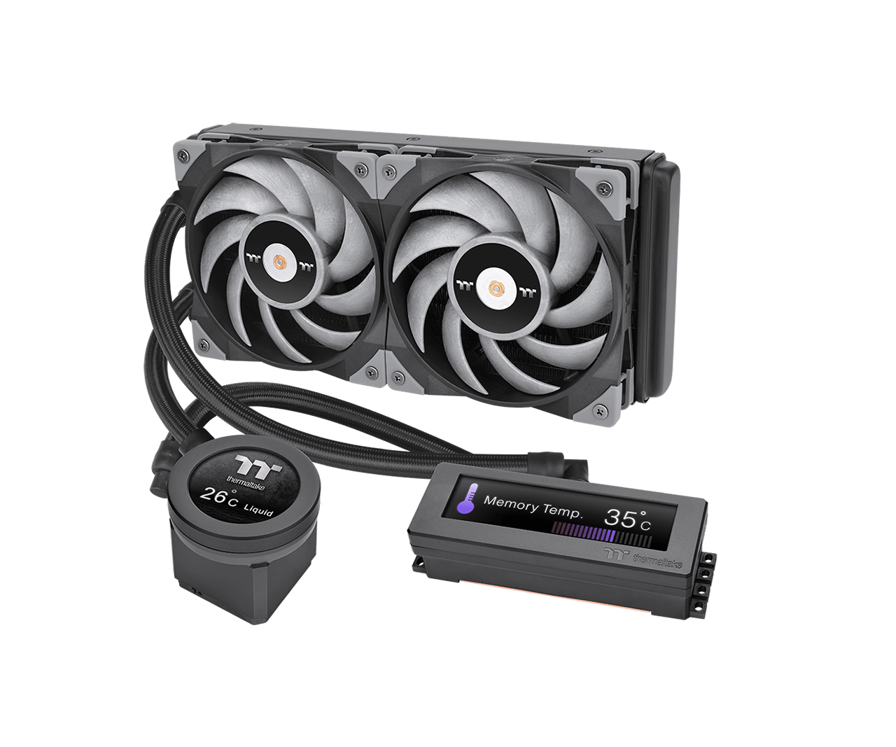 Die Frequenz und die Echtzeit-Temperatur können Sie direkt auf den großen LCD Displays überwachen. Mit der Software TT RGB Plus 2.0 können Sie Bilder oder GIFs hochladen, um dem Ganzen noch mehr Flair zu verleihen.