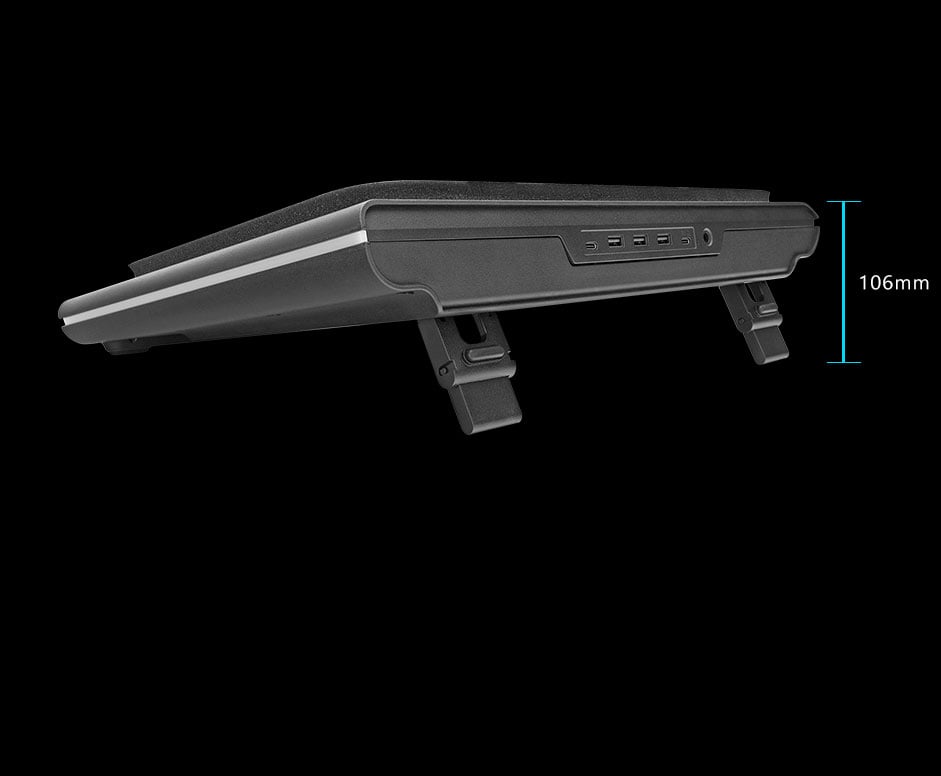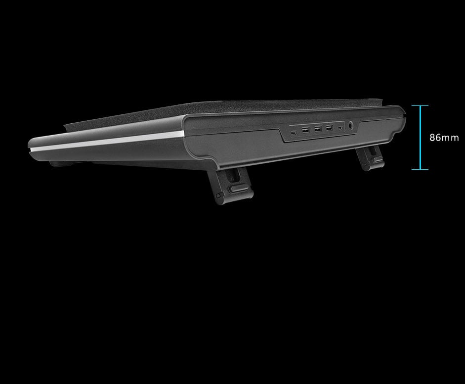 Die Rückseite des Notebook-Kühlers ist mit mehreren I/O-Anschlüssen ausgestattet, die erweiterte Anschlussmöglichkeiten bieten. Sobald der Massive EXTREME an Ihr Notebook angeschlossen ist, bietet er drei zusätzliche USB 2.0-Anschlüsse und einen Typ-C-Anschluss mit Schnellladefunktion und Hochgeschwindigkeitsdatenübertragung. Dies ermöglicht die nahtlose Integration von Peripheriegeräten wie Tastaturen, Mäusen und anderen Geräten.